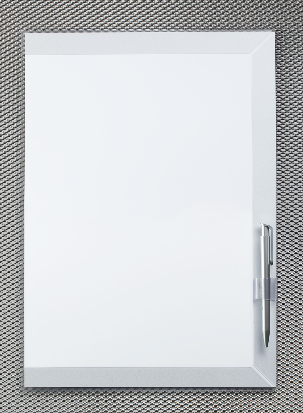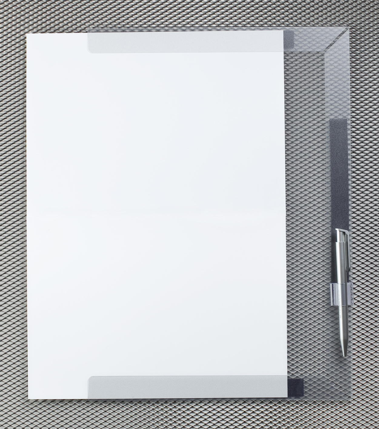 Die Vorderseite ist offen, das Blatt kann beim Beschriften in der Halterung bleiben.