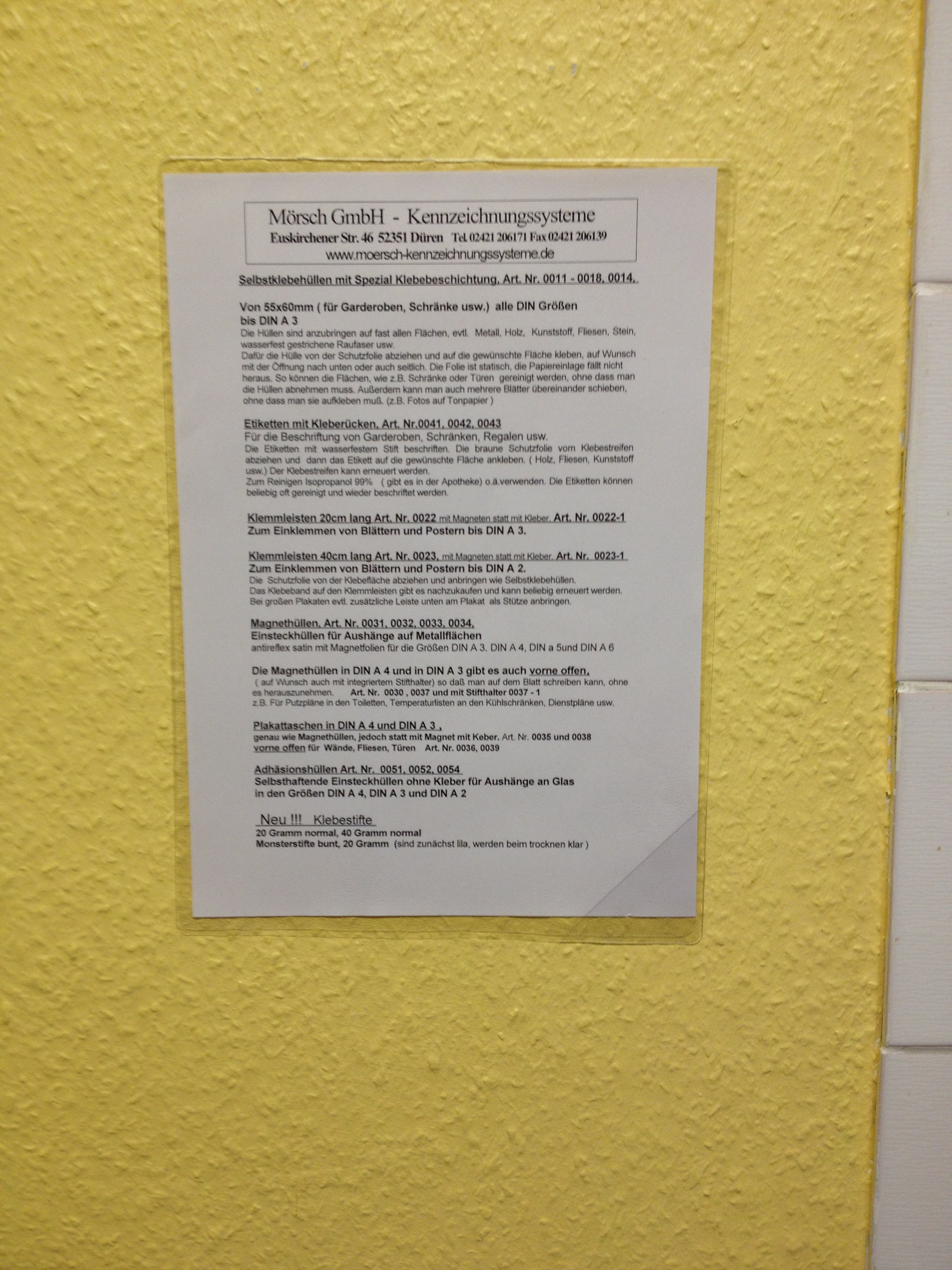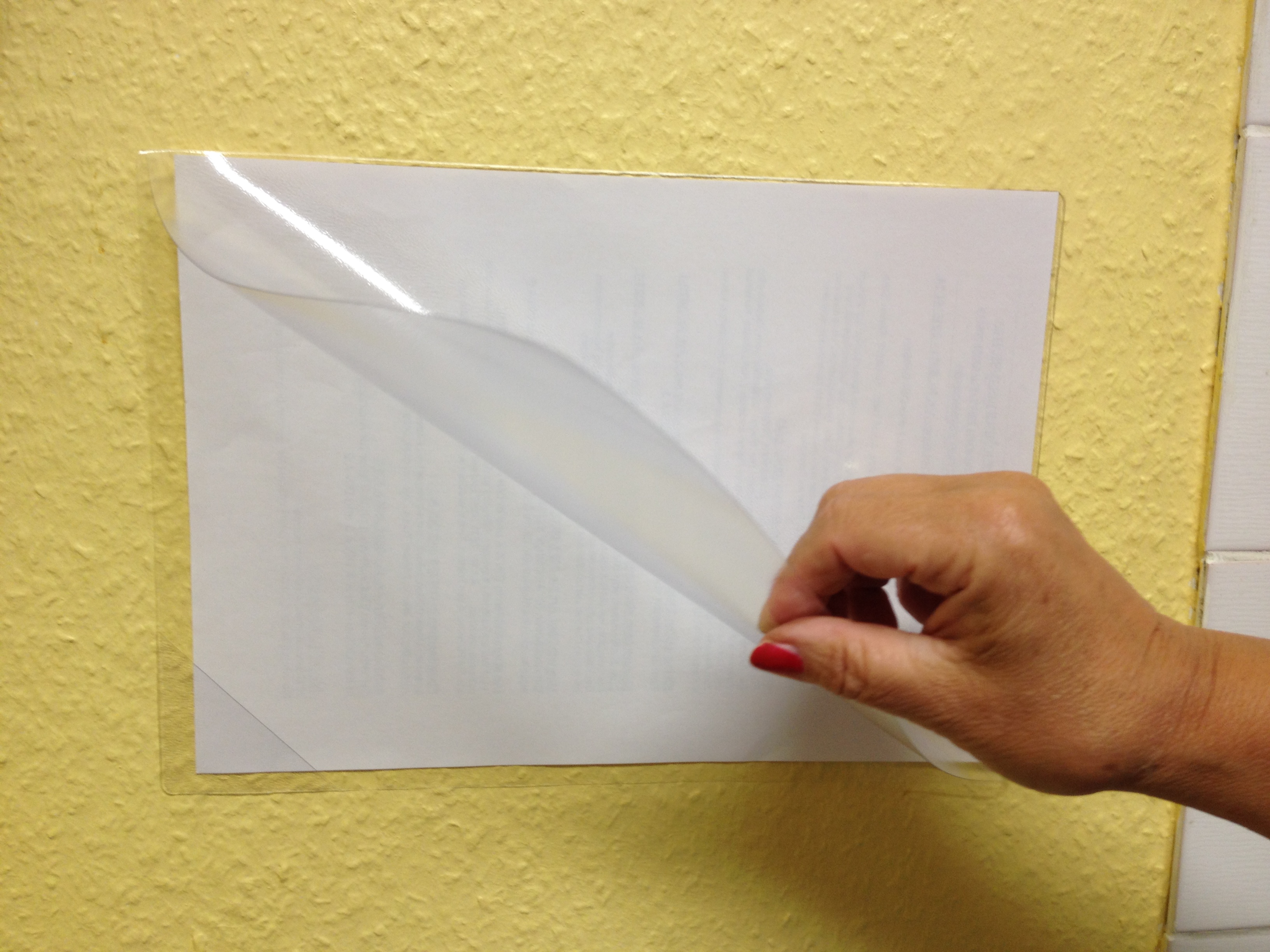 Dies und die gute Verarbeitung, ermöglicht es, die Klarsichthüllen auf fast allen Flächen wie z.B. Holz, Glas, Kunststoff, Fliesen, Stein, Metall wasserfest gestrichene Raufaser usw.anzubringen und auch wieder abzunehmen.